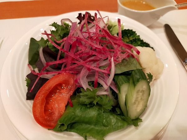 細切りビーツと紫タマネギの薄切りがのった華やかな装いで、みずみずしい!選んだ野菜ドレッシングは多いかなと思いながらも、あまりの美味しさに全部かけてしまいました。