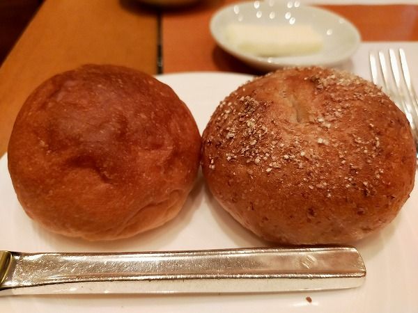 パンは2種類でおかわりもできました。左のパンはほんのり甘くて、右のパンは少し塩気があってどちらも病みつきな美味しさです。