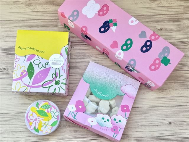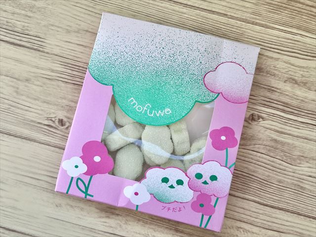 お花が咲いている、春らしいやさしいピンクのパッケージデザインの「幸せのmofuwaプチ」。