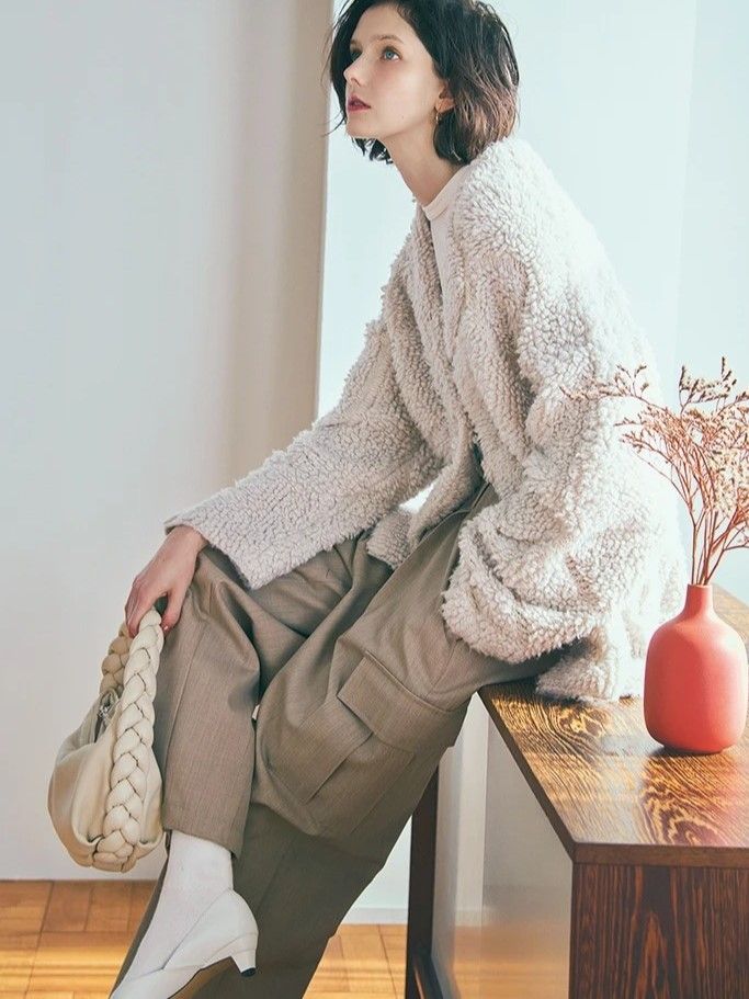 ふわふわしたニットカーディガンと、白やベージュ、グレーなどを多用した優しい色味で、カジュアル「過ぎない」カーゴパンツスタイル。これからの季節に向く、近づきたくなる新たなレパートリーに組み込んで。