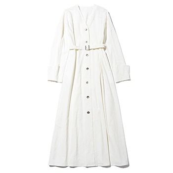 「白のシンプルな長い丈でそでの折り返しもアクセント。ノーカラーのシャツワンピでレイヤードもしやすく、付属のベルトを締めればより美しいフレアシルエットに。シーンを問わずに着回せる1着」(スタイリスト・高木千智さん)