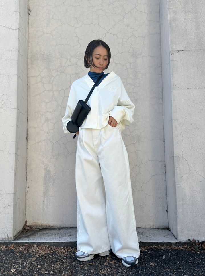 シアートップスをプラスしてスポーツアイテムを大人っぽく。「オールホワイトコーデにブルー&ブラックをポイントに差してモードライクにまとめました。カジュアルな中にもスタイリッシュなエッセンスを忘れずに」