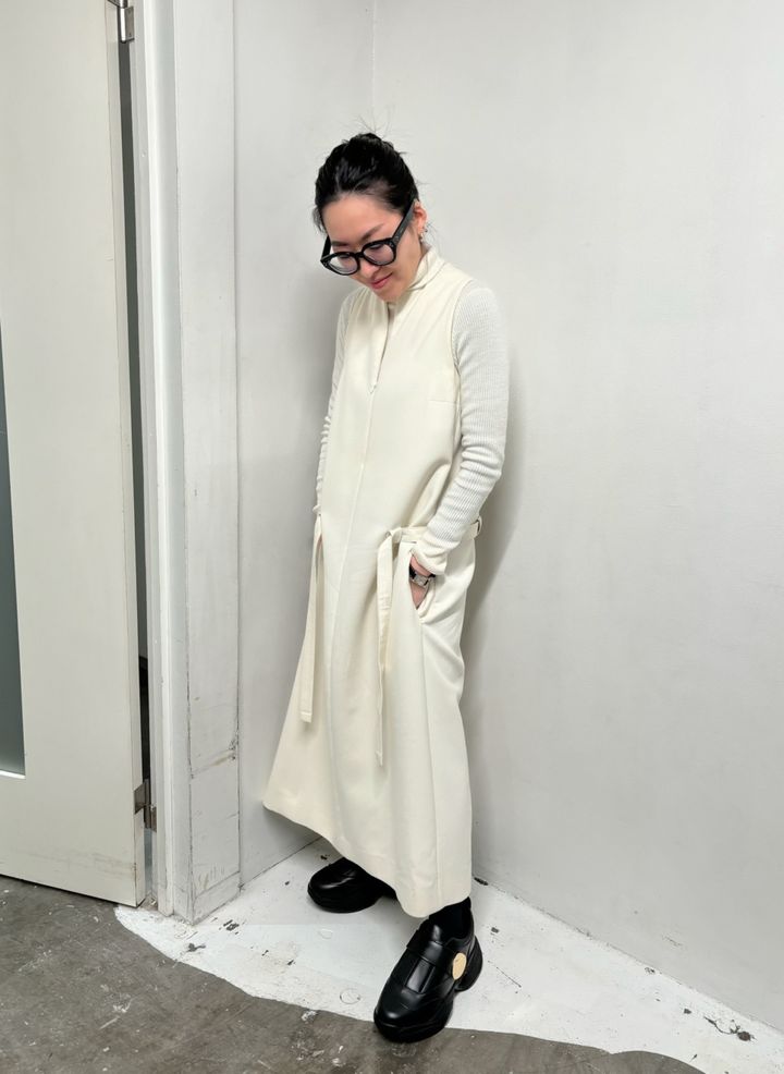 アウターのレイヤードが作る奥行きのあるワントーンコーデ。「アームウォーマーや毛足の長いパンツなど、温かみのある素材を使いながらも、明るめのカラーでどこか春を意識しています」