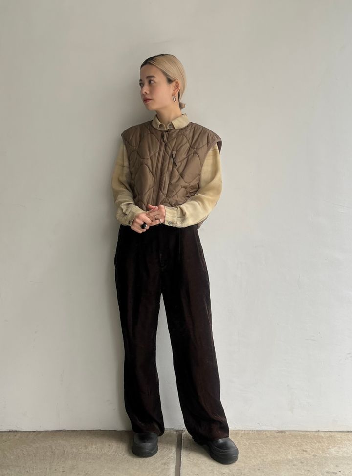 キレイめアイテム×異素材使いでラフなナイロンベストを上品に。「軽くて暖かいジェーン スミスのナイロンベスト。ベージュやブラウンでトーンをまとめつつ、異なる素材を組み合わせて変化を出しました」