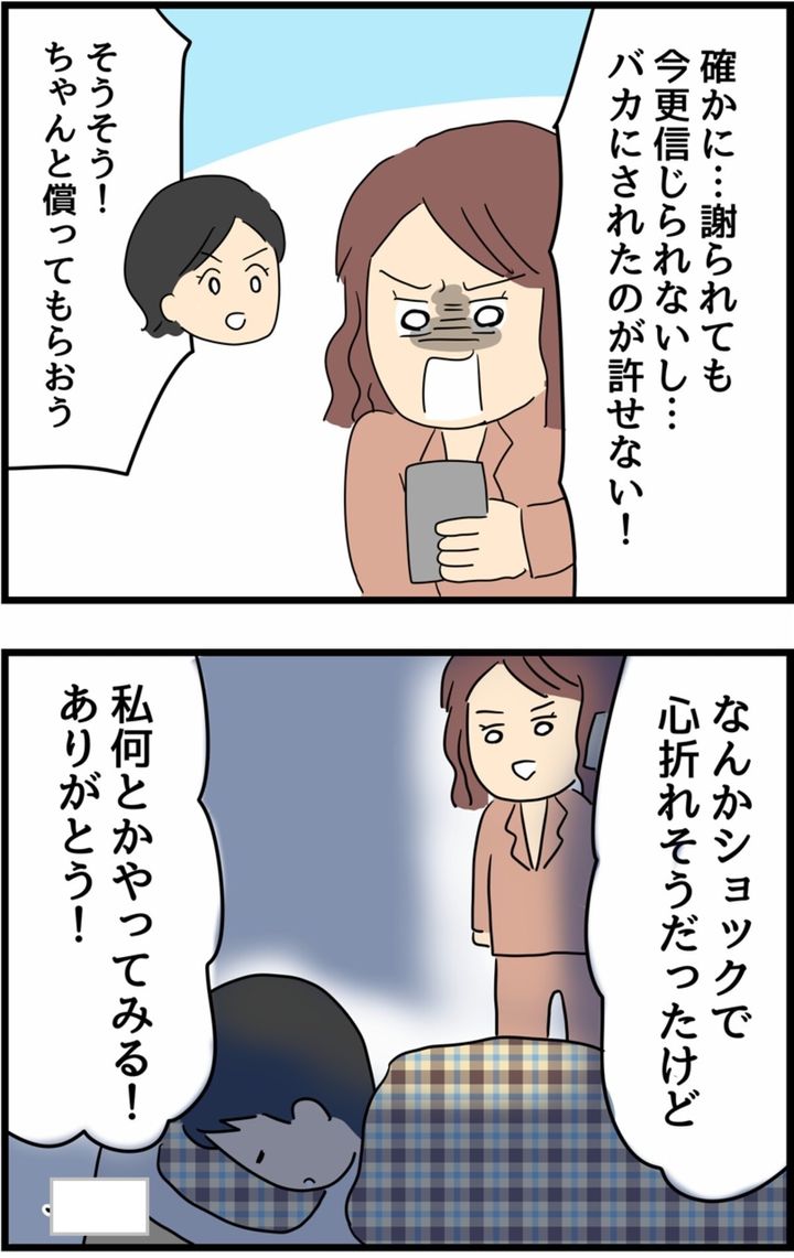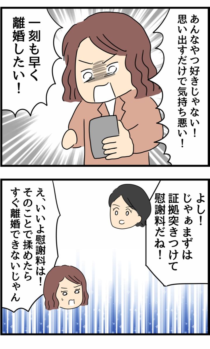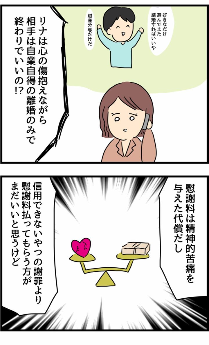 当初は慰謝料のことは考えていませんでしたが、友人のアドバイスで慰謝料を請求すると決めます。ショックで心が折れそうなリナさんでしたが、夫と闘う気力が湧いてきたようですね。