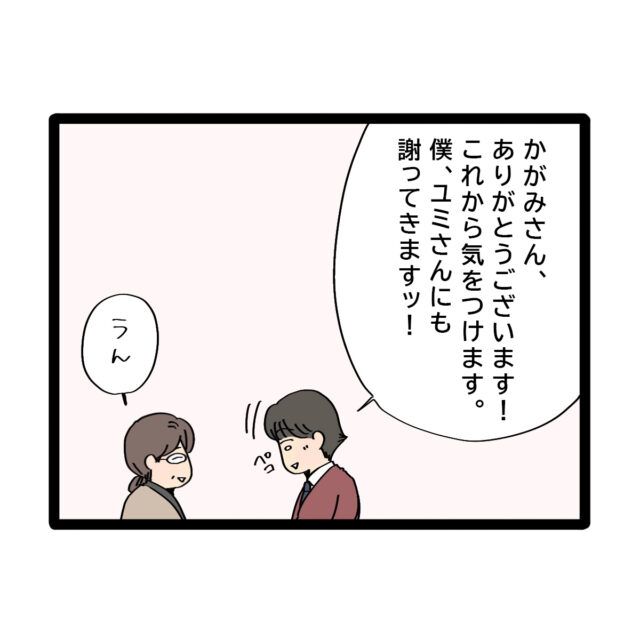 「かがみさん、ありがとうございます!これから気をつけます。僕・・ユミさんにも謝ってきますっ!」