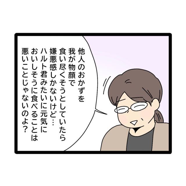 「他人のおかずを我が物顔で食い尽くそうとしていたら嫌悪感しかないけど・・ハルトくんみたいに元気においしそうに食べることは悪いことじゃないのよ?」