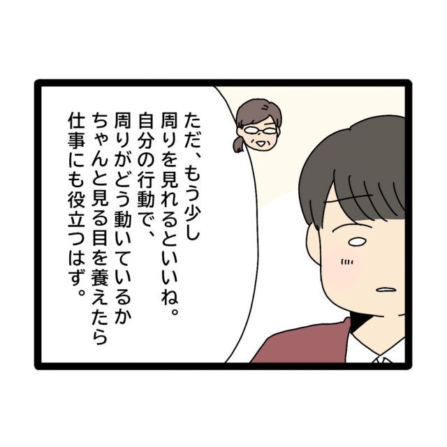 「ただ、もう少し周りを見られるといいね。自分の行動で、周りがどう動いているかちゃんと見る目を養えたら仕事にも役立つはず」