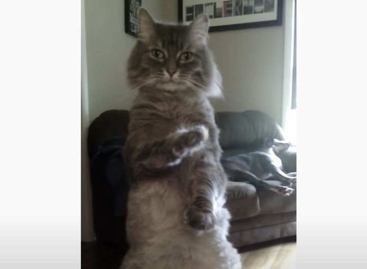 カメラ目線で、2本足で立っているこちらの猫さん。