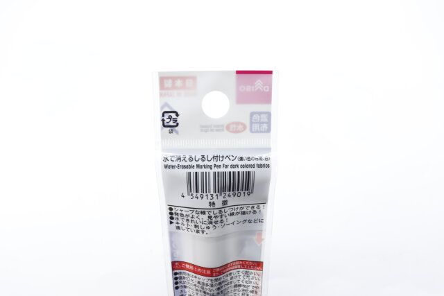 その正体はこちらの「水で消えるしるし付けペン(濃い色の布用、白)」。お値段は110円(税込)です。
