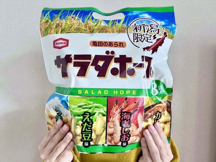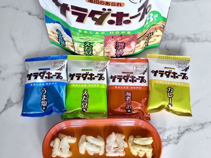 新潟県限定で販売されている、もち米100%のひとくちあられ「サラダホープ」をご存知でしょうか。筆者は、新潟県民の友人からいただいたことがあり、大好きなお菓子です。今回ご紹介するのは、うま塩味、えだ豆味、海老しお味、カレー味の4種の味が楽しめるアソート。ビッグサイズで、インパクトも抜群。中身は、食べきりサイズが8袋入りなので、ばらまき土産にもぴったりです。そんなおすすめ土産「サラダホープ 4種ミックス」を、実食ルポでお届けします!