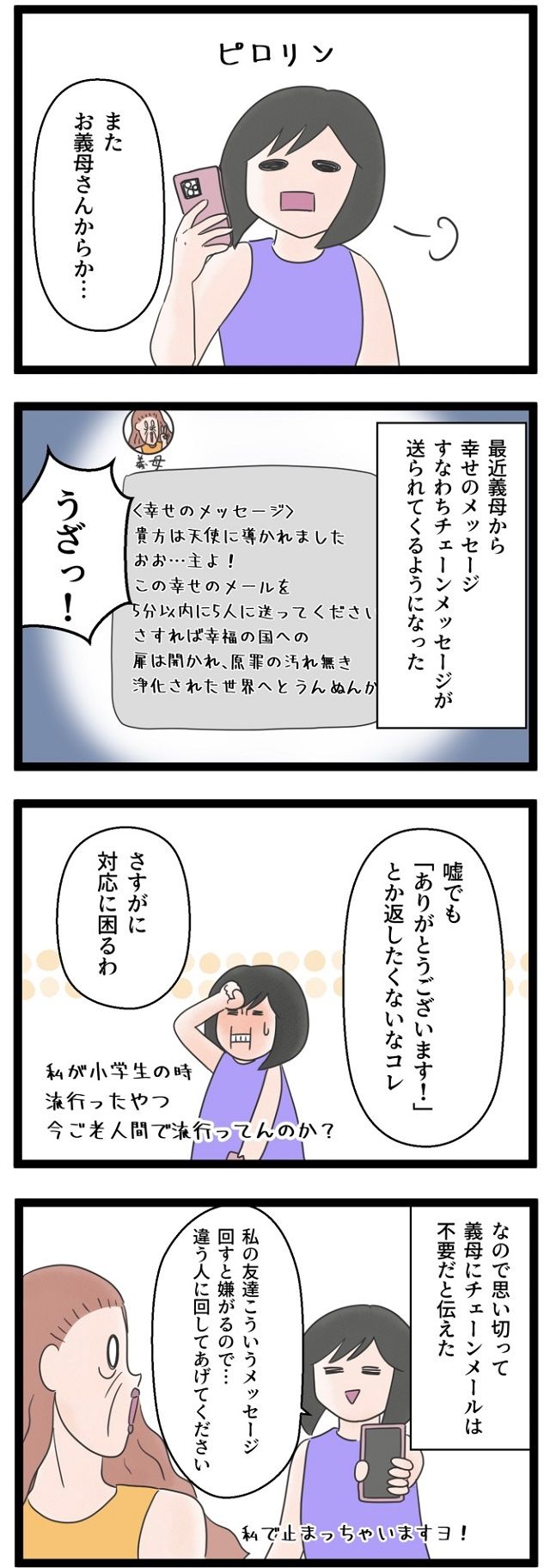 なんと、最近お義母さんから「幸せのメッセージ」すなわちチェーンメッセージが送られてくるようになったのです。