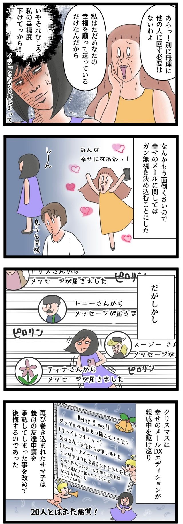 と心の中で呟くサマ子さんは、すっかり面倒くさくなり「幸せのメッセージ」はガン無視を決め込むことにしたのでした。