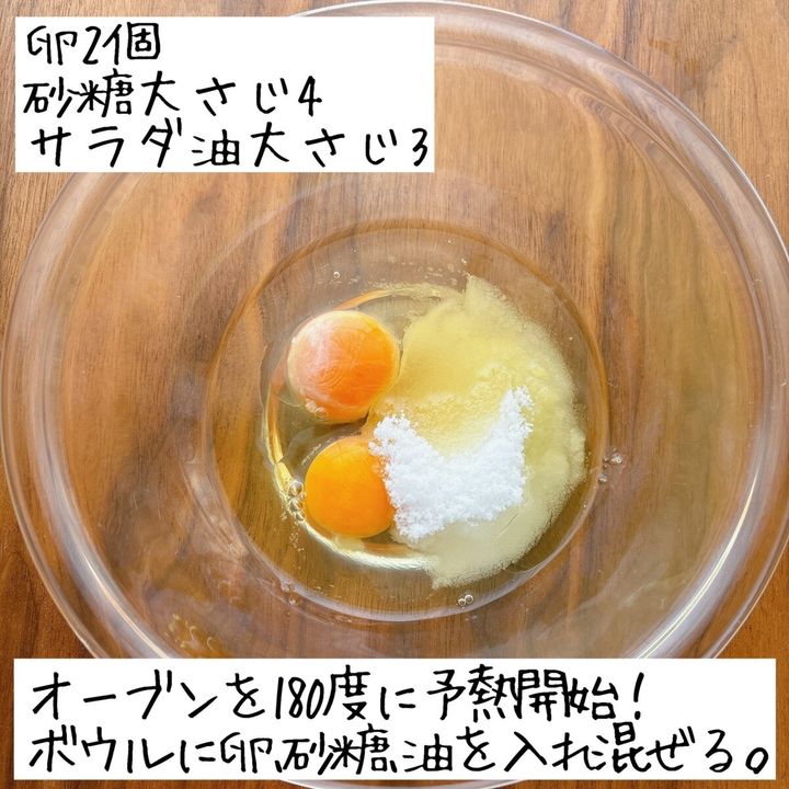 オーブンを180度に予熱開始する。ボウルに卵、砂糖、油を入れてすり混ぜる。