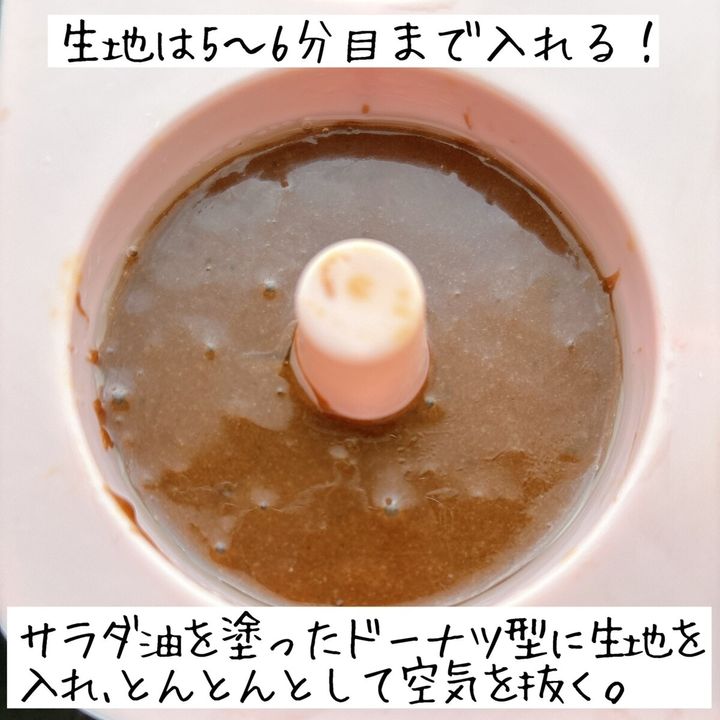 サラダ油を塗ったドーナツ型に②を入れ、とんとんとして空気を抜く。生地は5~6分目を目安にいれてください。