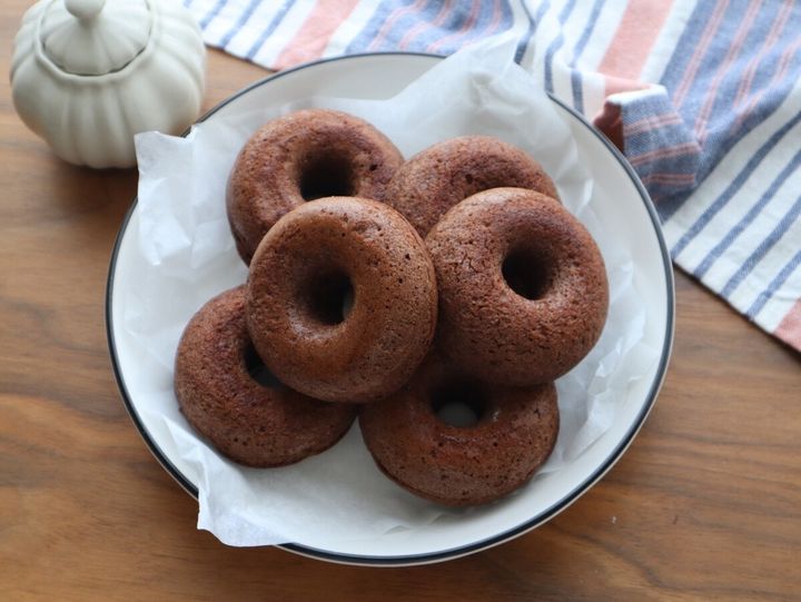 ココアパウダーを使って作るドーナツなので、チョコレートデビューがまだのお子さまと一緒に食べることができますよ。揚げずに作る焼きドーナツなので、あっさりふわふわ食感に仕上がります。
