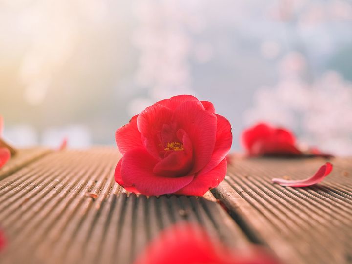 赤いカメリアをイメージしたチョコレートは、淡い5色の花びらが折り重なっており、まるで本物の花のように美しい。