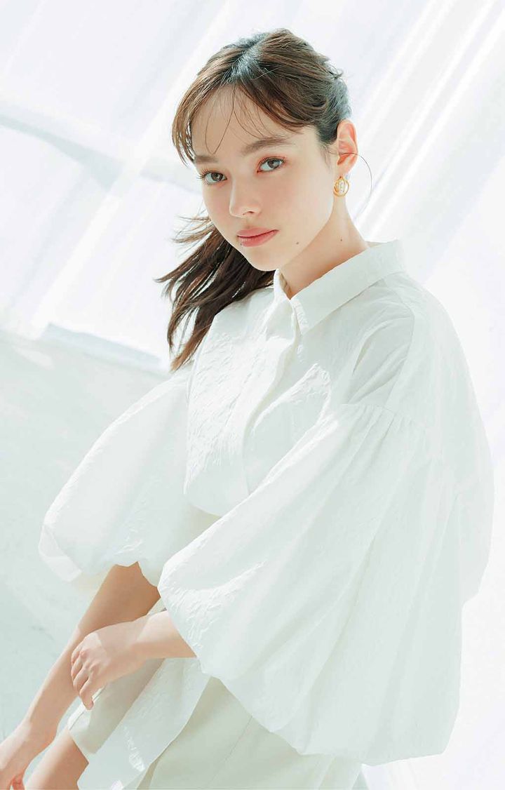 ブラウス ¥52,800/ソブ(フィルム)、ピアス ¥3300/ローズバット(ローズバット ルミネエスト新宿店)、ショートパンツ ¥7,700/リゼクシー(リゼクシー 渋谷109店)