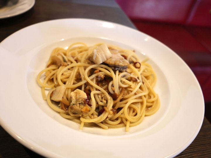 ペペロンチーノになめこ⁉ とメニューを見たときびっくりしたけど、気になって頼んでみたら、ほどよいにんにくの香りとホタテの存在感、なめこ独特のぬめりがほどよくからみ合ってとってもおいしい!