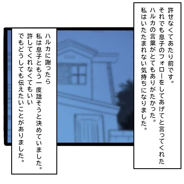 許せなくてあたり前です。でもあの子は私が不幸になることは望んでいない。息子ののフォローをしてあげてと言ってくれました。あの子は昔から優しかった。その言葉がとてもありがたかった。私は息子ともう1度話そうと決めていました。許してくれなくてもいい。