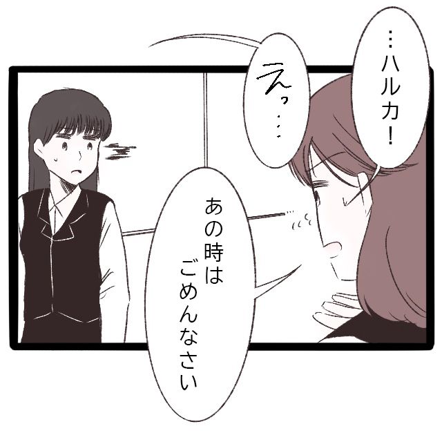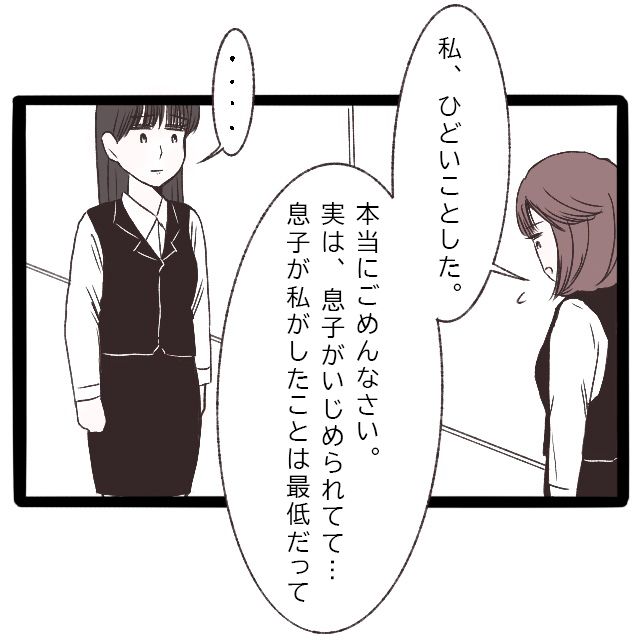 「私、ひどいことしたよね。本当にごめんなさい。息子・・いじめられてて・・息子から私がしたことは最低だって言われたの。」