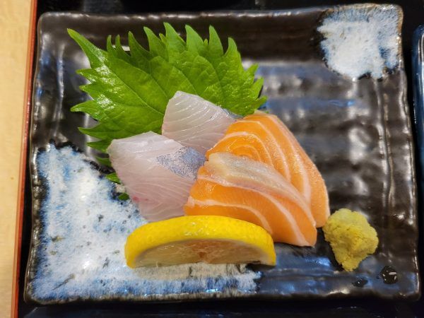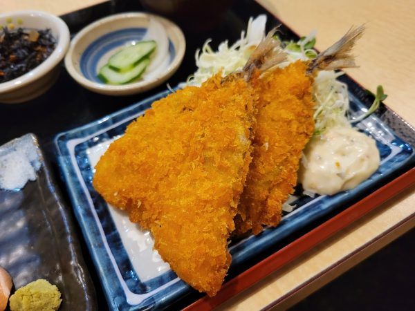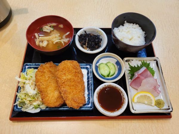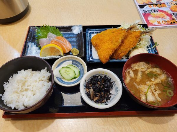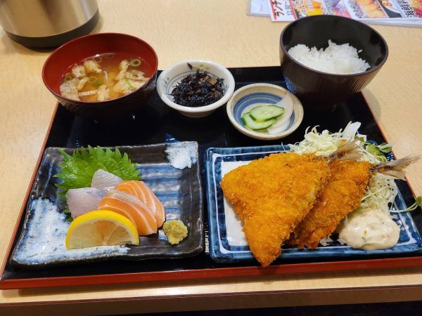 Aセット(800円)のメインは、お刺身2種とアジフライ2枚