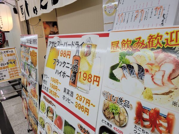「安くて旨い海鮮料理ここに有り!老若男女楽しめる大衆居酒屋はドリンクのコスパも最高!」の大衆酒場です!さすが、「昼飲み大歓迎」って書いてあります!アサヒスーパードライにハイボール、サワー、焼酎の「198円」が、おいでおいでとるなるなを誘っています。(笑)