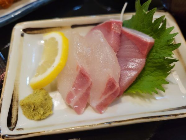 新鮮な鯛とブリのお刺身です。鯛の弾力がすごい!これはいいっ!海鮮がおいしいです。定食ですが、お刺身も揚げ物もあって、酒の肴にもなる定食だわ(笑)。さすが、昼飲み大歓迎って書いてあるお店ですね。