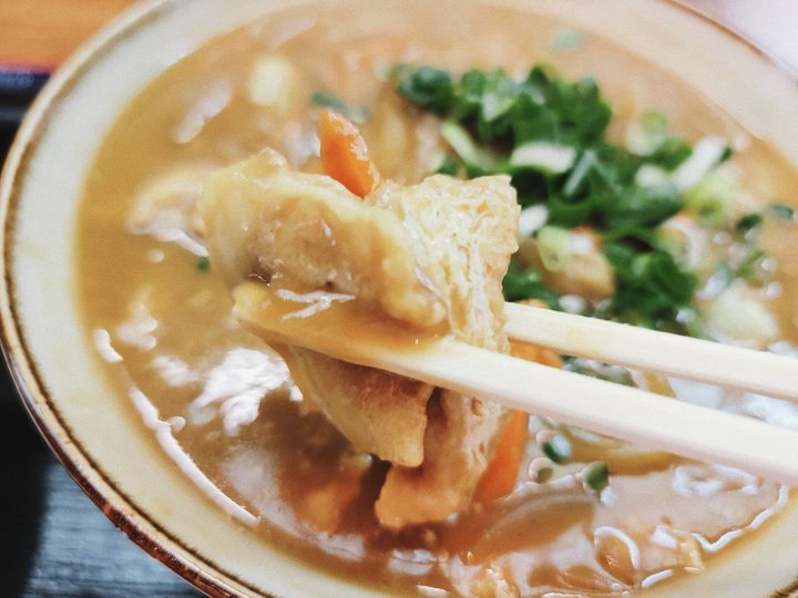 「和風カレーうどん」は、甘めに炊いたおあげと豚肉、ニンジン、たまねぎが入ったさらっとしたタイプ。