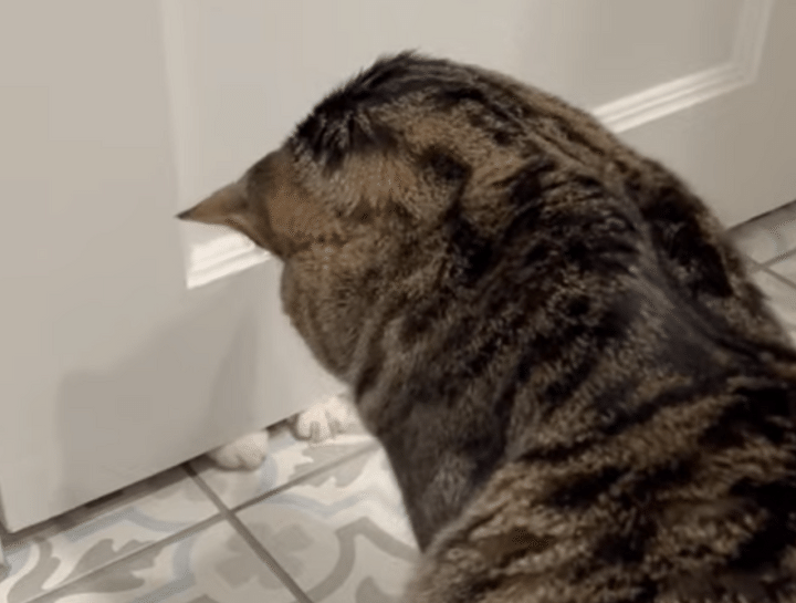 3. ドアの隙間から見える友達を助けたい猫さん。 クリームパンのお手手を握ろうと頑張る!