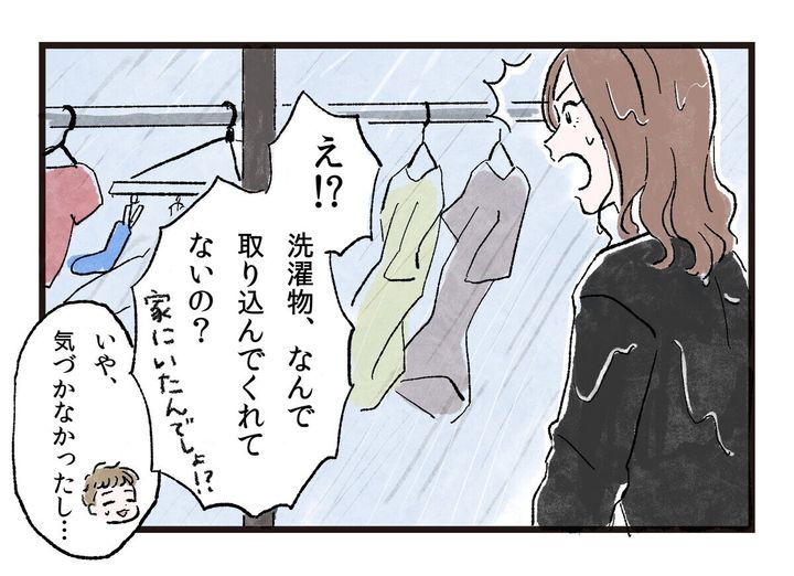 雨の中、息子と帰宅した遥。夫は洗濯物を入れておらず…。さらに、息子がうんちをしたのに、オムツを替えられないと言いに来て…。