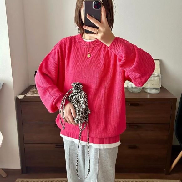ゆったりしたシルエットですが、薄手なのでボトムにインも可能!ニットにパンツのシンプルな組み合わせも、鮮やかなピンクで華やかな着こなしに♡着用するだけでおしゃれ見えする優秀アイテムです。
