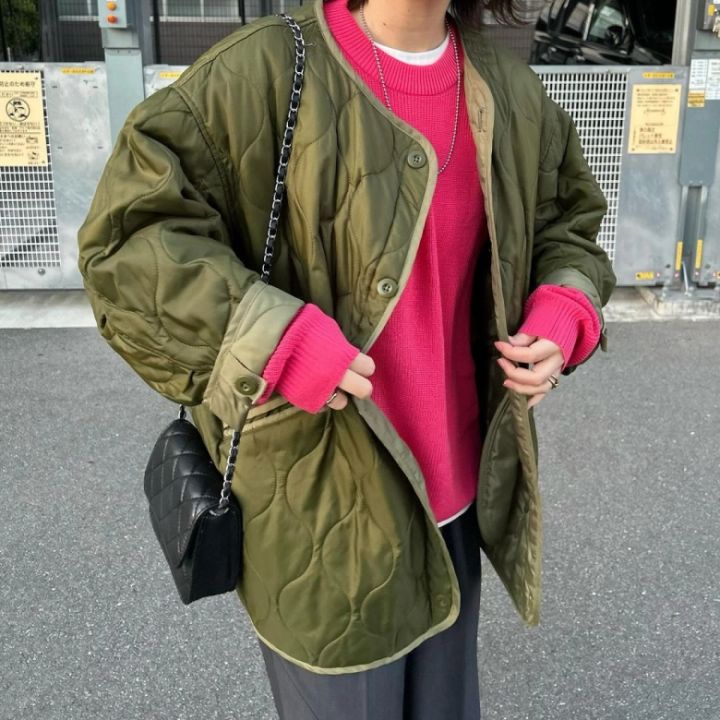 カーキのアウターはピンクとの相性もバッチリ!アウターの袖をまくってニットをチラリと見せるのがニクい♡下に白のカットソーを合わせるのがこなれ感のポイント。コーデの主役になるアイテムです。
