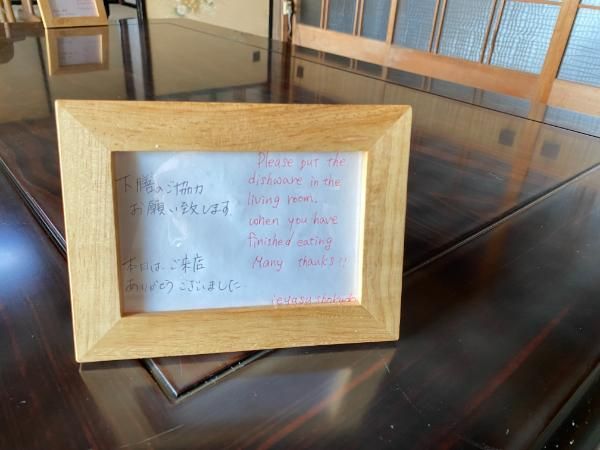 外国からの観光客も多いのでしょうか。英語での注意書きが。女性オーナーさんが一人で切り盛りしているため、混雑時は大忙し。お食事のあとは食器をキッチンまで運びましょう。