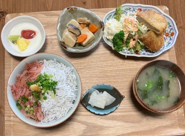 駿河湾の釜揚げしらすと桜えびが、ほかほかごはんにのっかっています。黒はんぺんのフライもついていて、静岡名物がてんこ盛り。