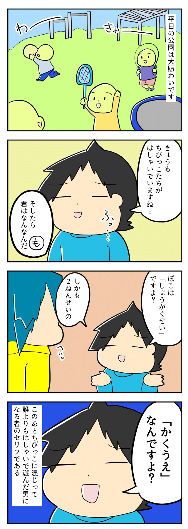 この後、息子は誰よりもはしゃぎながら公園中を駆け回っておりました。