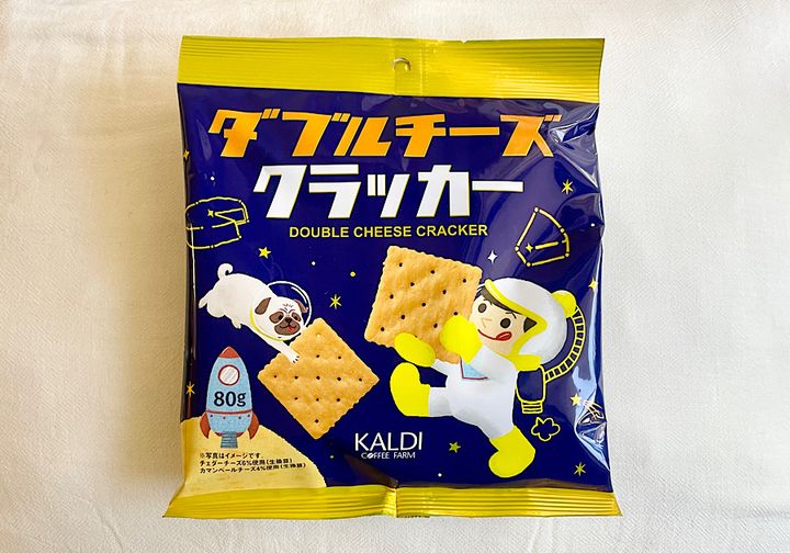 続いて紹介するのは「ダブルチーズクラッカー」。チェダーチーズとカマンベールのチーズパウダーをふんだんに使用したカルディオリジナルブランドのクラッカーなのだとか。店員さんによると「チーズ好きの人にオススメ。子どもも好きな味だと思います!」と教えてくれました。