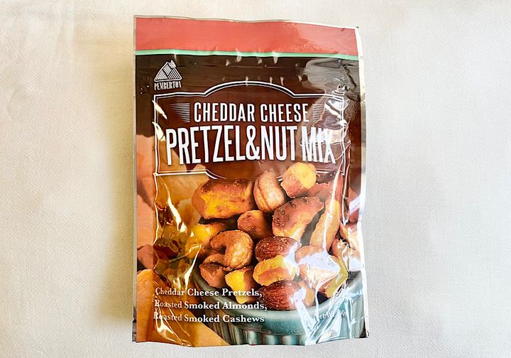 最後にご紹介するのは「ペンバートン チェダーチーズ プレッツェル&ナッツミックス」。チェダーチーズのプレッツェルと、スモーキーに味付けされたナッツがセットになっているアメリカから来たお菓子です。