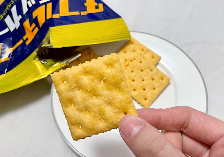 食べてみると、濃厚なチーズの風味と、サクッと軽めの食感は、どんどん食べ進めたくなるおいしさ。クセがなく食べやすいので、子どもが好きな味という店員さんのコメントにも納得です。シンプルなクラッカーの味に飽きた人や物足りないなと思う人にこそピッタリ。トッピングや調味料を足さなくても、クラッカー単体で十分満足できる味わいを堪能できます。