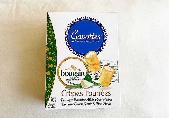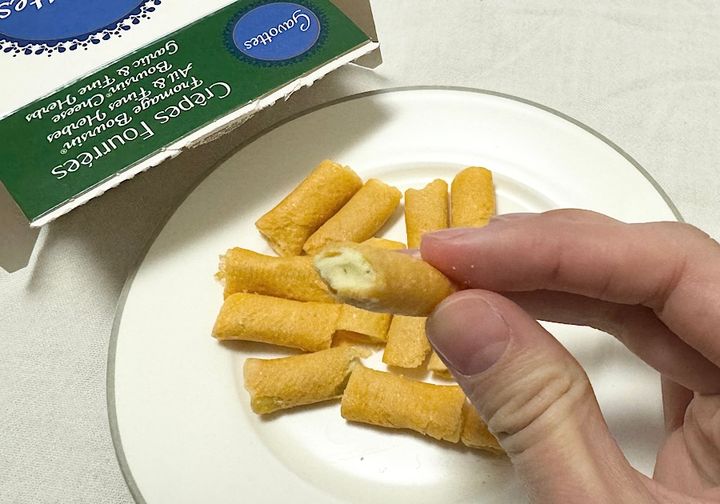 まず紹介するのは「ガヴォット ミニクレープ ブルサンクリーム」。使われているチーズは、カルディで販売されているチーズのなかでも人気の「ブルサン フレッシュチーズ」のガーリックとハーブのフレーバー。おつまみにピッタリなチーズフィリングを、サクサクの薄皮のレースクレープ生地で包んで作られているフランス産のミニクレープお菓子なのだとか。店員さんが「チーズの商品のなかで特に売れています!」と教えてくれました。