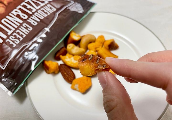 チーズの味わいと塩味が程よくまろやか。しょっぱすぎないので、お酒の味を邪魔しないタイプのおつまみです。プレッツェルだけでなく、大粒のアーモンドやカシューナッツがたっぷり入っているので飽きずに楽しめます。ビールやレモンサワーと一緒に楽しむと相性抜群。