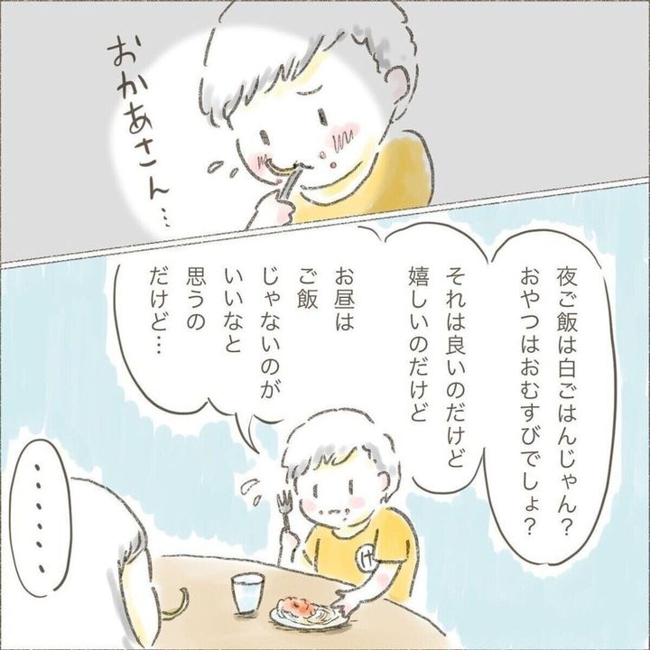 「白米の刑」が続くある日のこと。この日は昼食がスパゲティでした。米を炊くのが面倒という理由で、長男のけーくんもスパゲティにしてみると、ぽろっとかわいらしい本音を言ってくれました。
