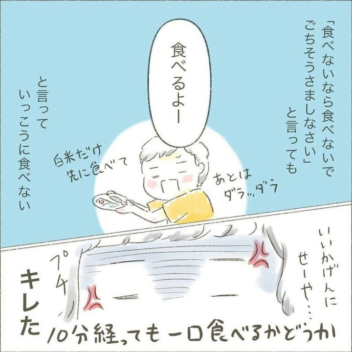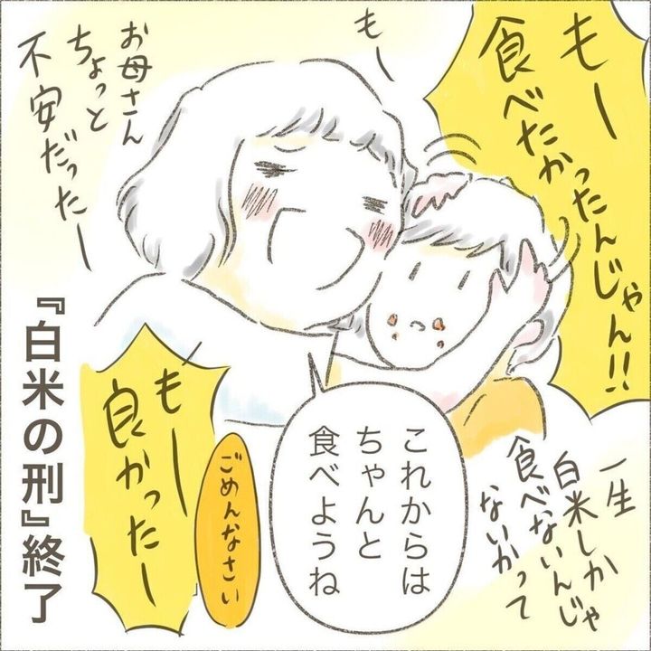 ある日、おかずを食べない長男けーくんに、「もう白米しか出さない」、と「白米の刑」を言い渡すせせらぎさん。