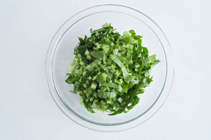 小松菜は根元を切り、幅5mmに刻んでボールに入れる。塩ふたつまみをふってもみ、5分ほどおいて水けをしっかり絞り、さらに塩小さじ1/3を加えて混ぜる。わかめは水でもどし、水けを絞って粗く刻む。