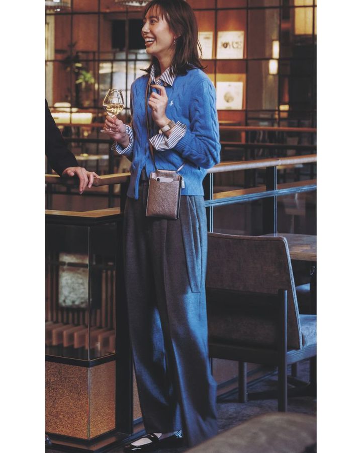 カーディガン¥35,200(ポロ ラルフ ローレン/ラルフ ローレン)シャツ¥18,700(アルページュストーリー/アルページュストーリー プレスルーム)パンツ¥52,800(カオス/カオス丸の内)スマホショルダー¥19,800(オルセット/アッシュプラスエリオトロープ)ローファー¥19,250(ルタロン グリーズ/ル タロン グリーズルミネ新宿店)ピアス¥23,100(マリハ)時計¥31,900(リップ/エイチエムエスウォッチストア 表参道)