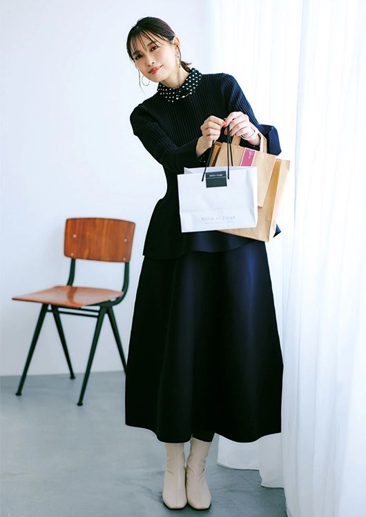 ニットセットアップ ニット¥9,990、ニットセットアップ スカート¥11,000/ともにPLST、水玉ブラウス¥6,590/ZARA(ザラ)、ショートブーツ¥3,990/GU、スマートウォッチ¥39,800/ガーミン、パールネックレス¥3,080、フープピアス¥1,760/ともにスリーフォータイム(ジオン商事)
