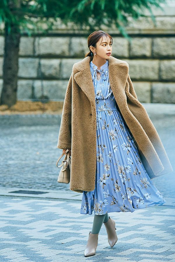 ボリューミーなコートとは裏腹に、揺れるプリーツワンピがレディな印象を演出。