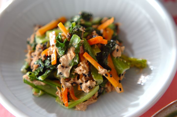 鉄分豊富な小松菜は毎日食べたい栄養価の高い野菜。今回は小松菜とニンジンにツナを加え、麺つゆとマヨネーズで子どもも食べやすい炒め物にアレンジしました。ツナの油は小松菜に量で調節してください。お弁当にもオススメです。