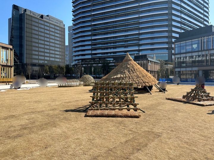天然芝の広場。訪れた際には竹や藁で作った遊具で遊べるイベントが開催されていました。(期間限定のため2024年2月12日に終了しています)ワークショップやイベントが今後も開催されていくようです。