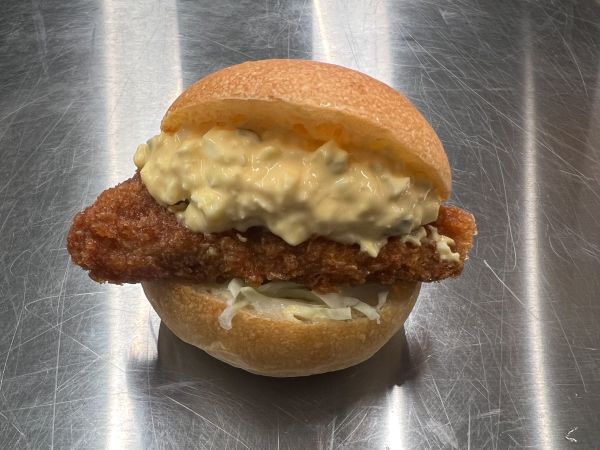 「自家製タルタルの魚フライサンド」450円 粗めにカットしたピクルスタルタルで魚フライが2倍美味しい!その日の仕入れによってアジフライかイワシフライのどちらかになります。
